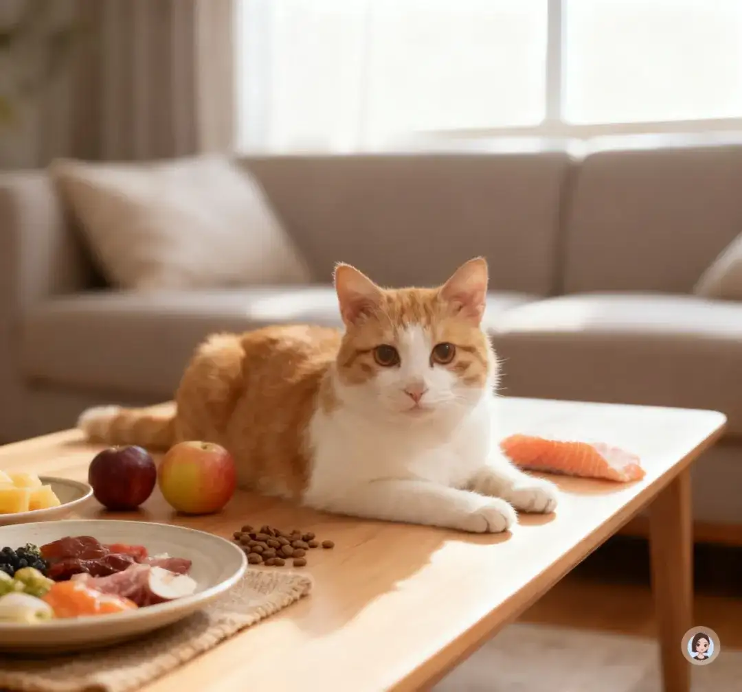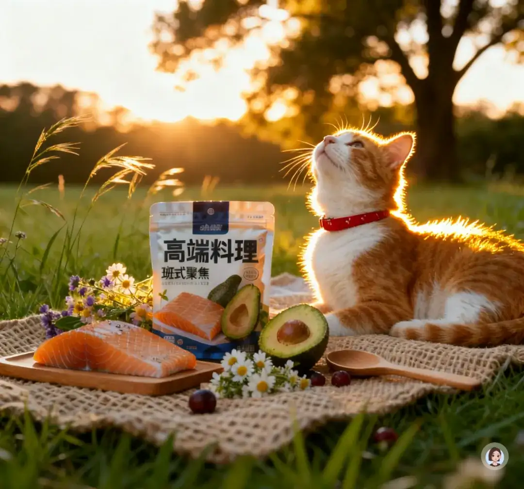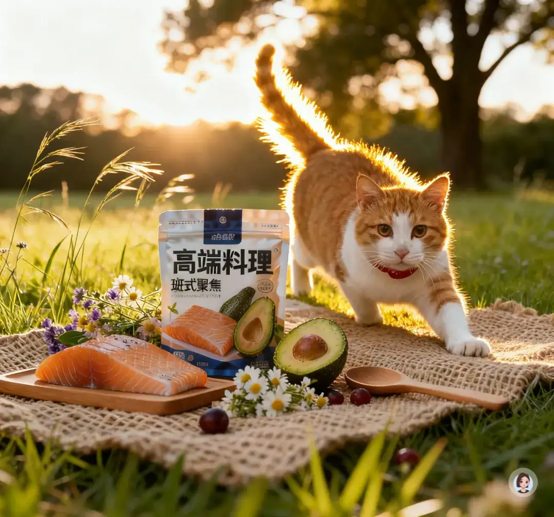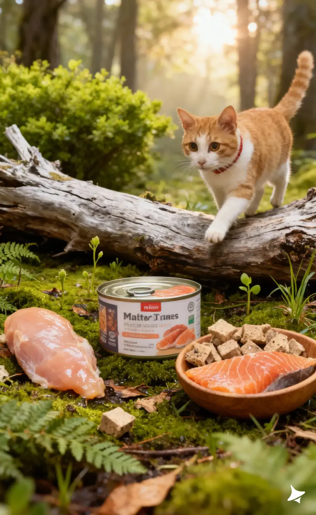 光线模拟树林间透下的偏暖自然光,中景构图,镜头轻微俯视,让产品位于视觉焦点,同时展示食材与猫咪细节,整体画面自然、原生态、干净且富有生命力。