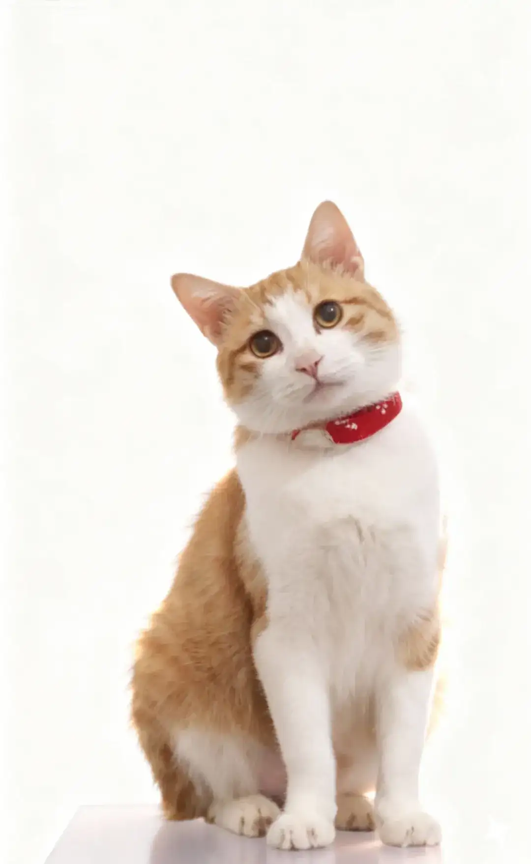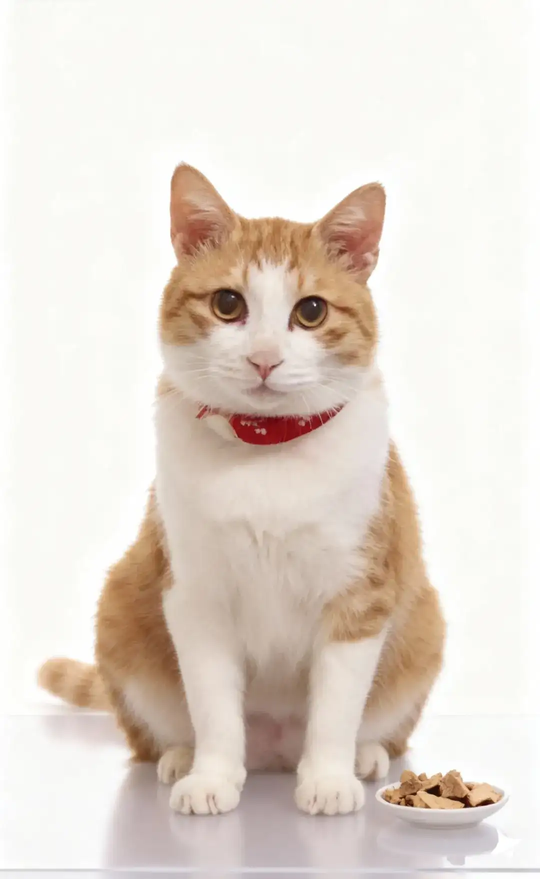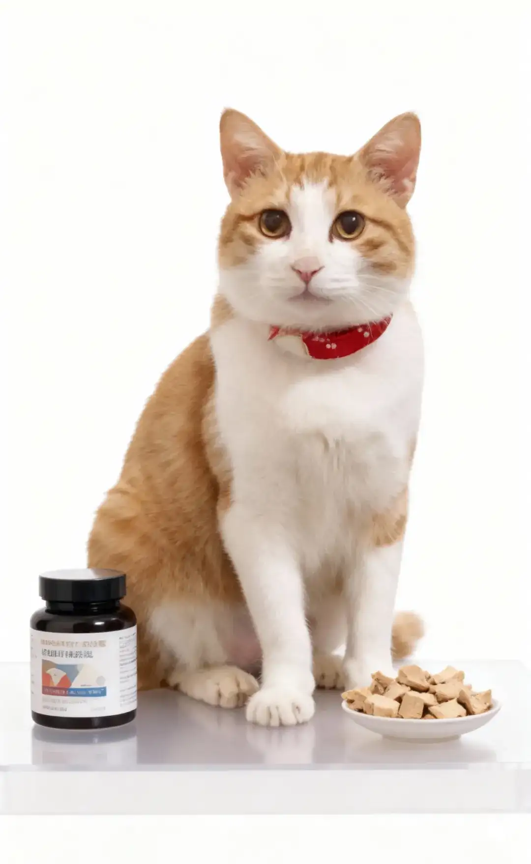 你的橘白猫咪坐在产品旁侧,姿态端正,红项圈在纯白背景中格外鲜明;猫咪毛发蓬松且质感细腻,光线在毛发边缘形成柔亮的“光晕感”。