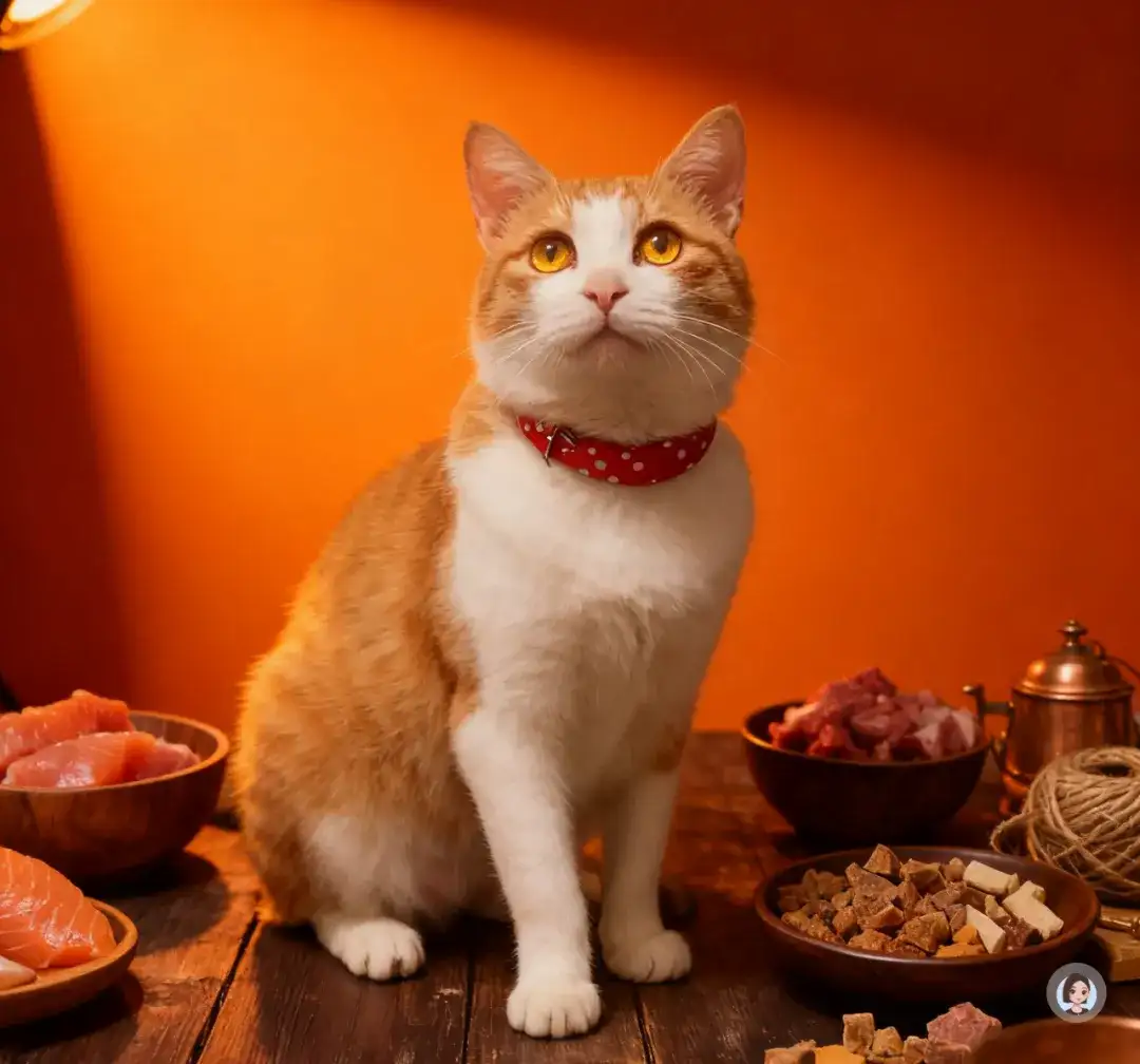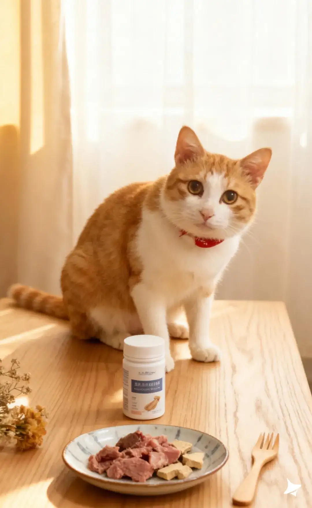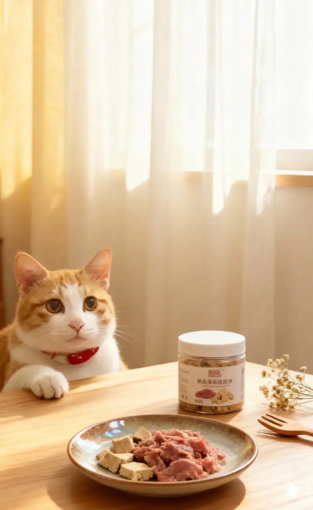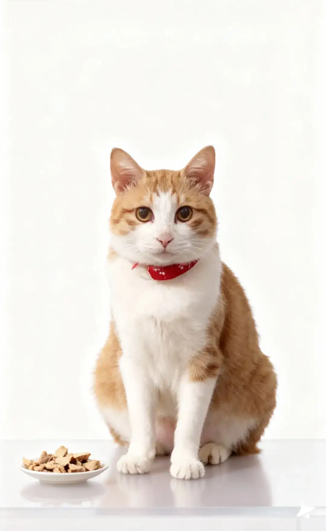 你的橘白猫咪坐在产品旁侧,姿态端正,红项圈在纯白背景中格外鲜明;猫咪毛发蓬松且质感细腻,光线在毛发边缘形成柔亮的“光晕感”。