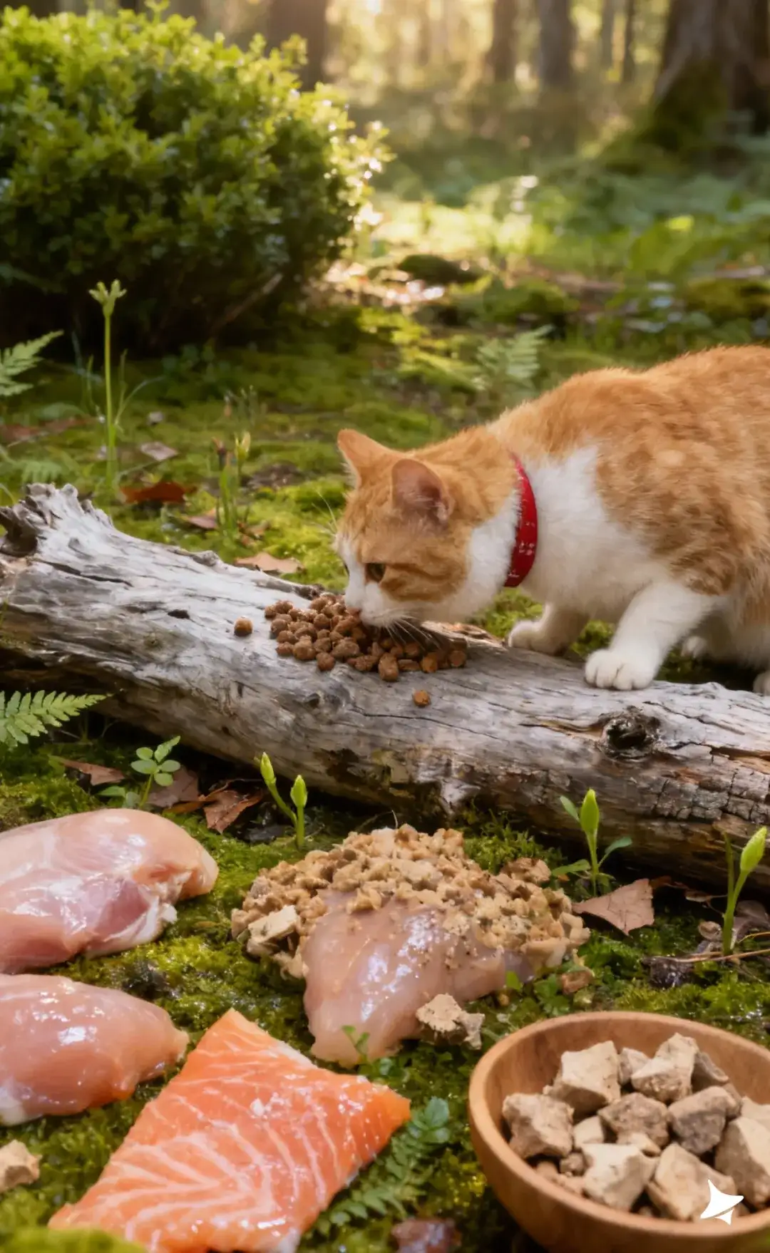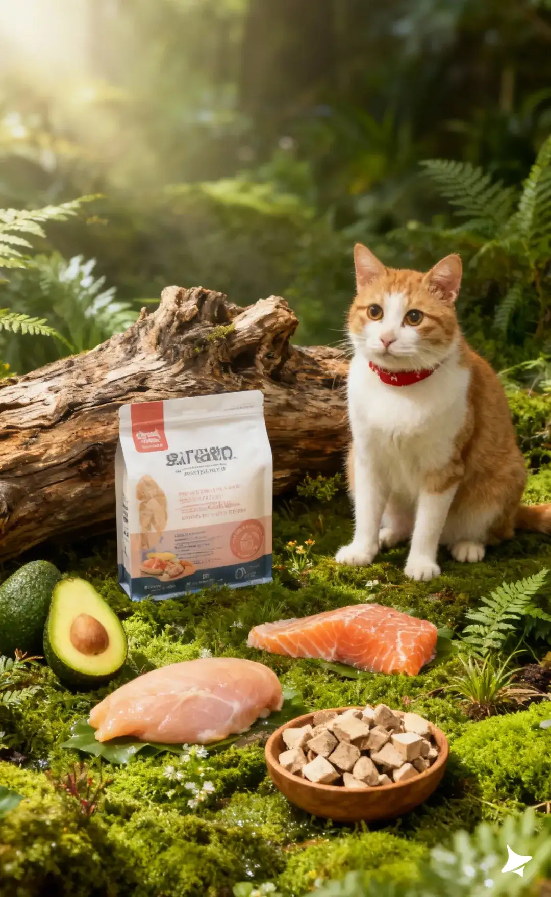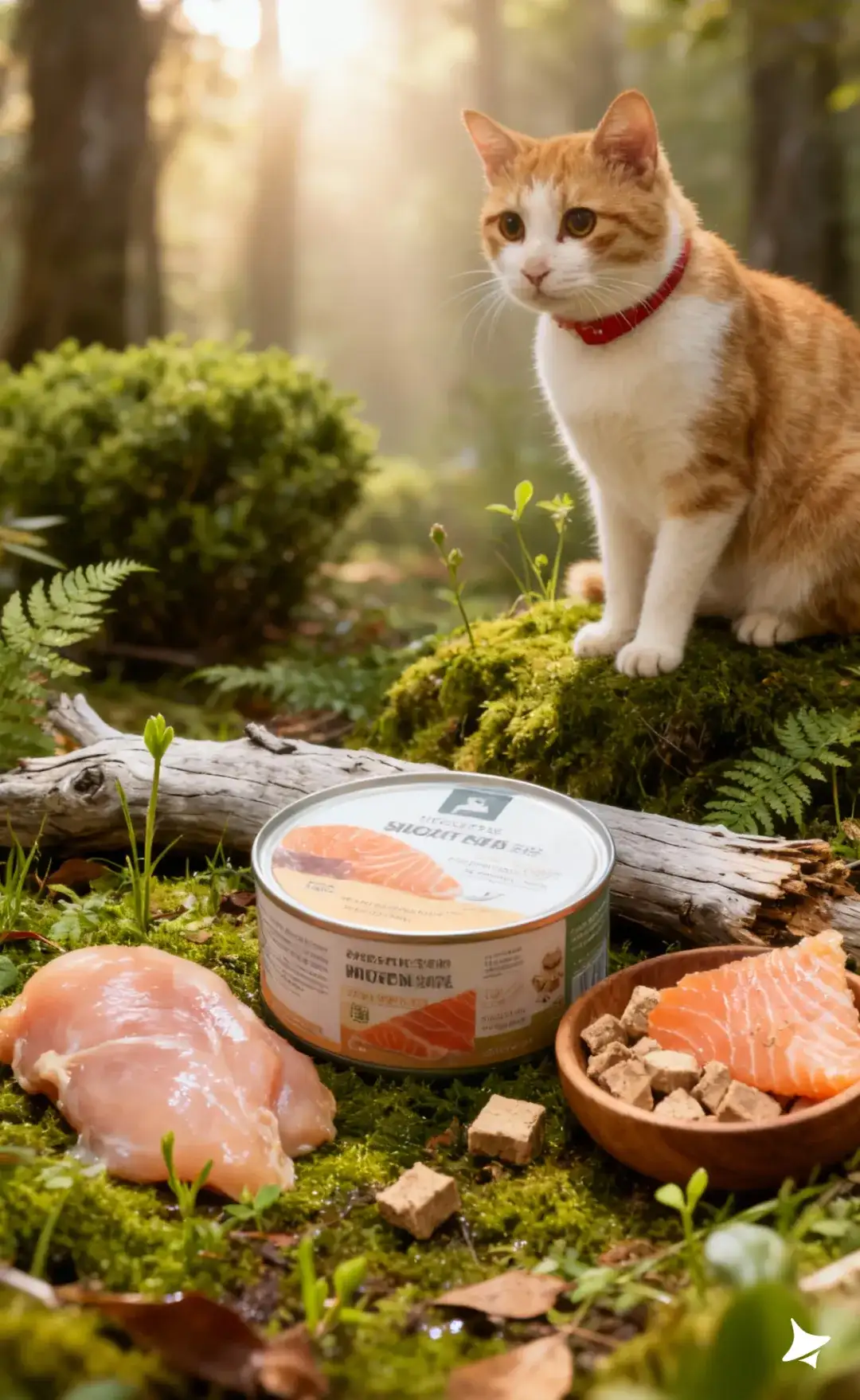 产品外侧铺有粗糙纹理的枯木树干,木头带有岁月裂纹、浅灰色干燥纹理,增强自然荒野感;周围摆放新鲜鸡胸肉(略带湿润光泽)、油脂纹路清晰的三文鱼片,以及木碗中的冻干块(呈颗粒质感,略有粉末)。橘白猫咪坐在右侧苔藓上,圆脸大眼注视产品,红色项圈增加点睛视觉;毛发被自然斑驳的光照出丝状立体感。
