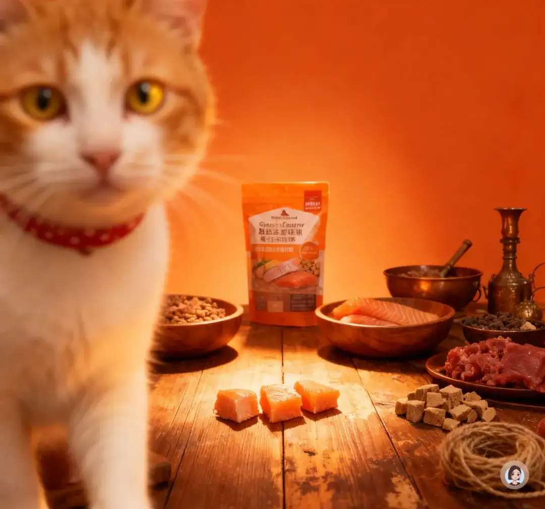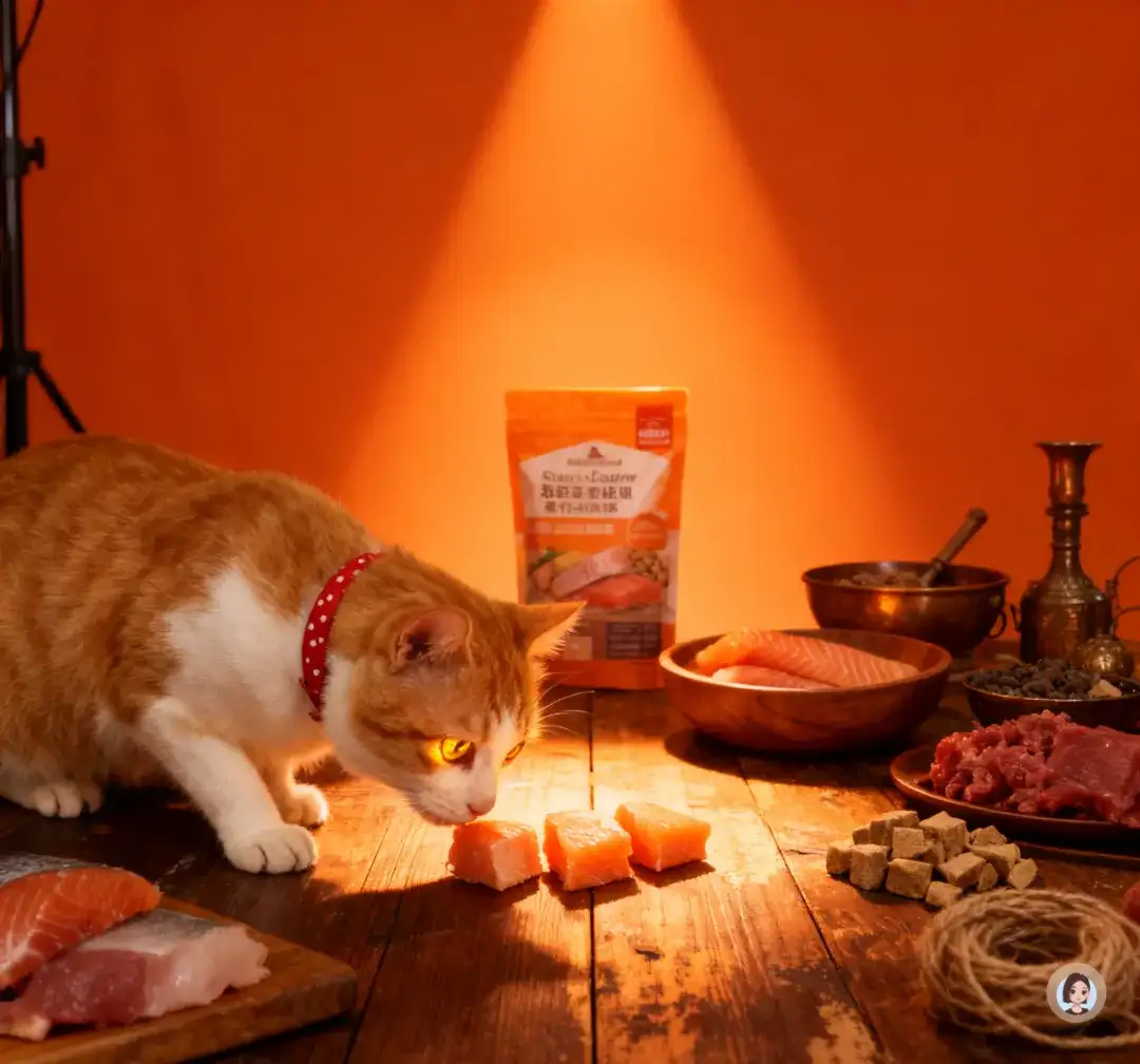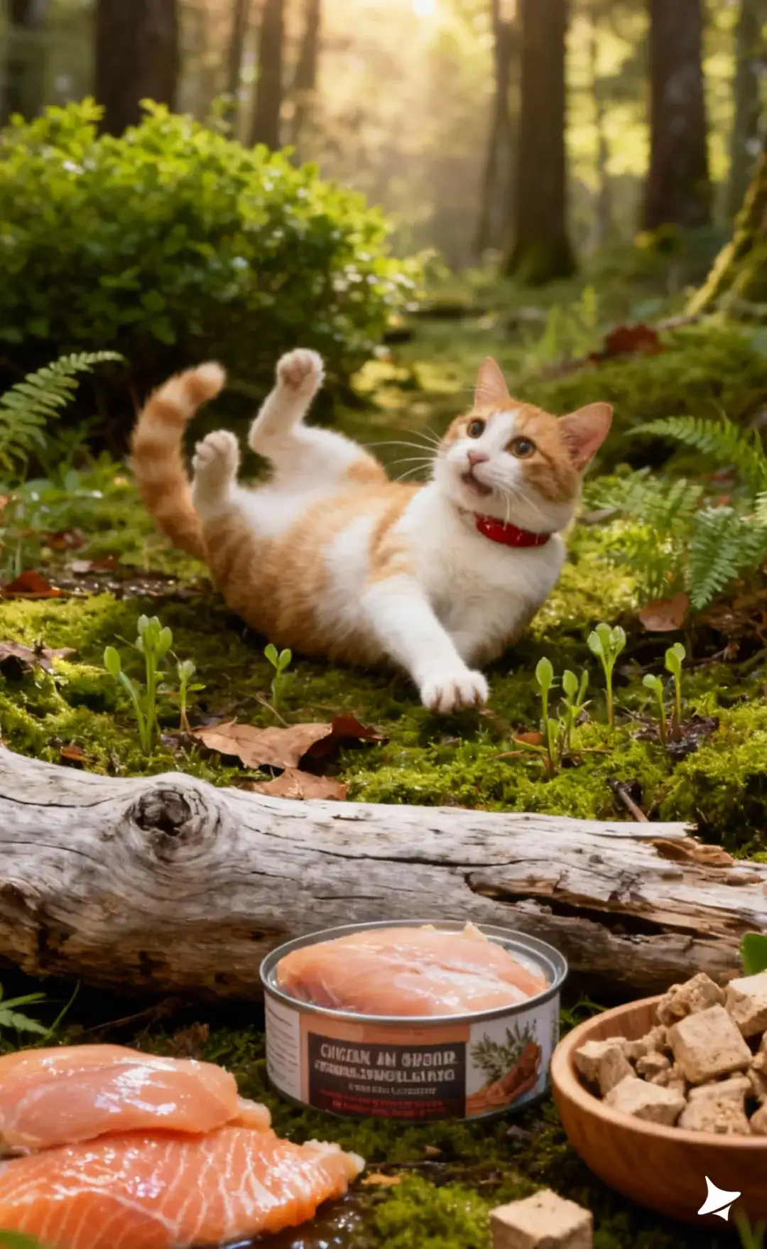 产品外侧铺有粗糙纹理的枯木树干,木头带有岁月裂纹、浅灰色干燥纹理,增强自然荒野感;周围摆放新鲜鸡胸肉(略带湿润光泽)、油脂纹路清晰的三文鱼片,以及木碗中的冻干块(呈颗粒质感,略有粉末)。橘白猫咪坐在右侧苔藓上,圆脸大眼注视产品,红色项圈增加点睛视觉;毛发被自然斑驳的光照出丝状立体感。