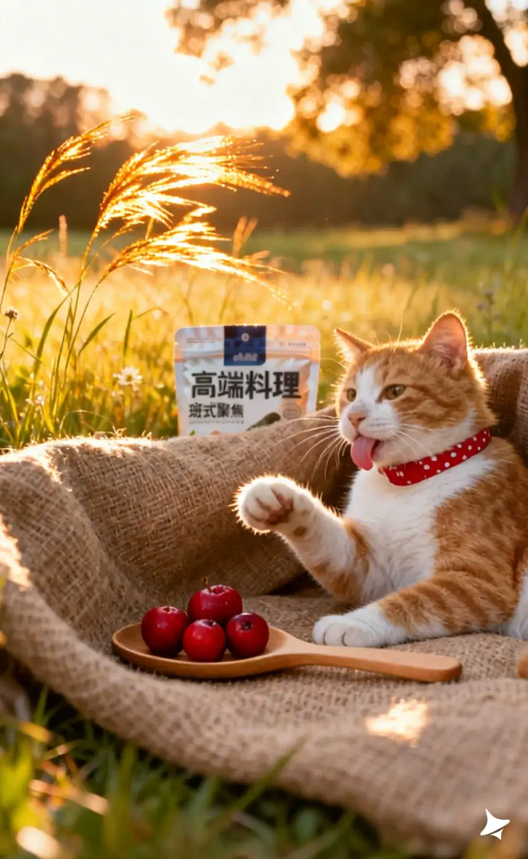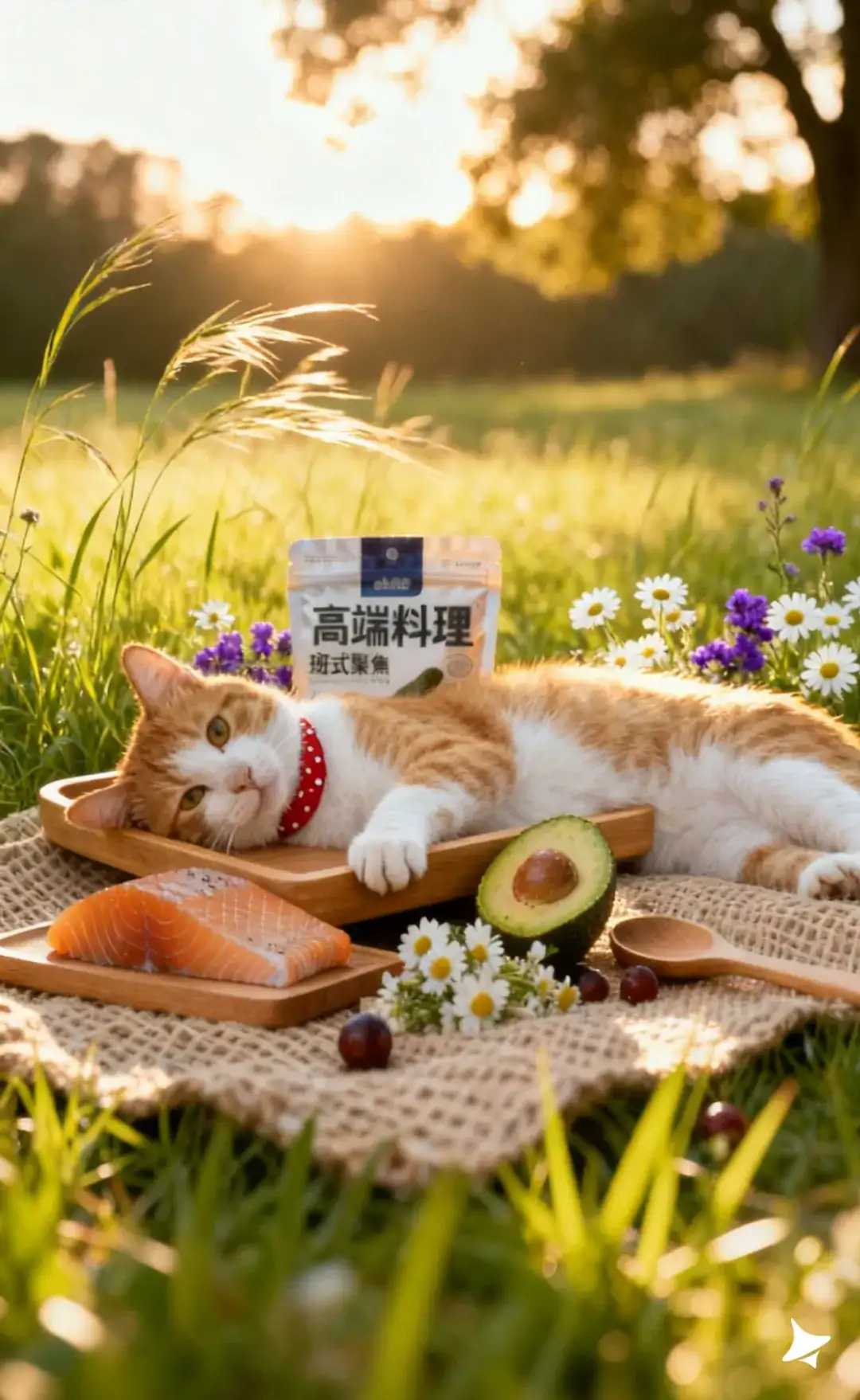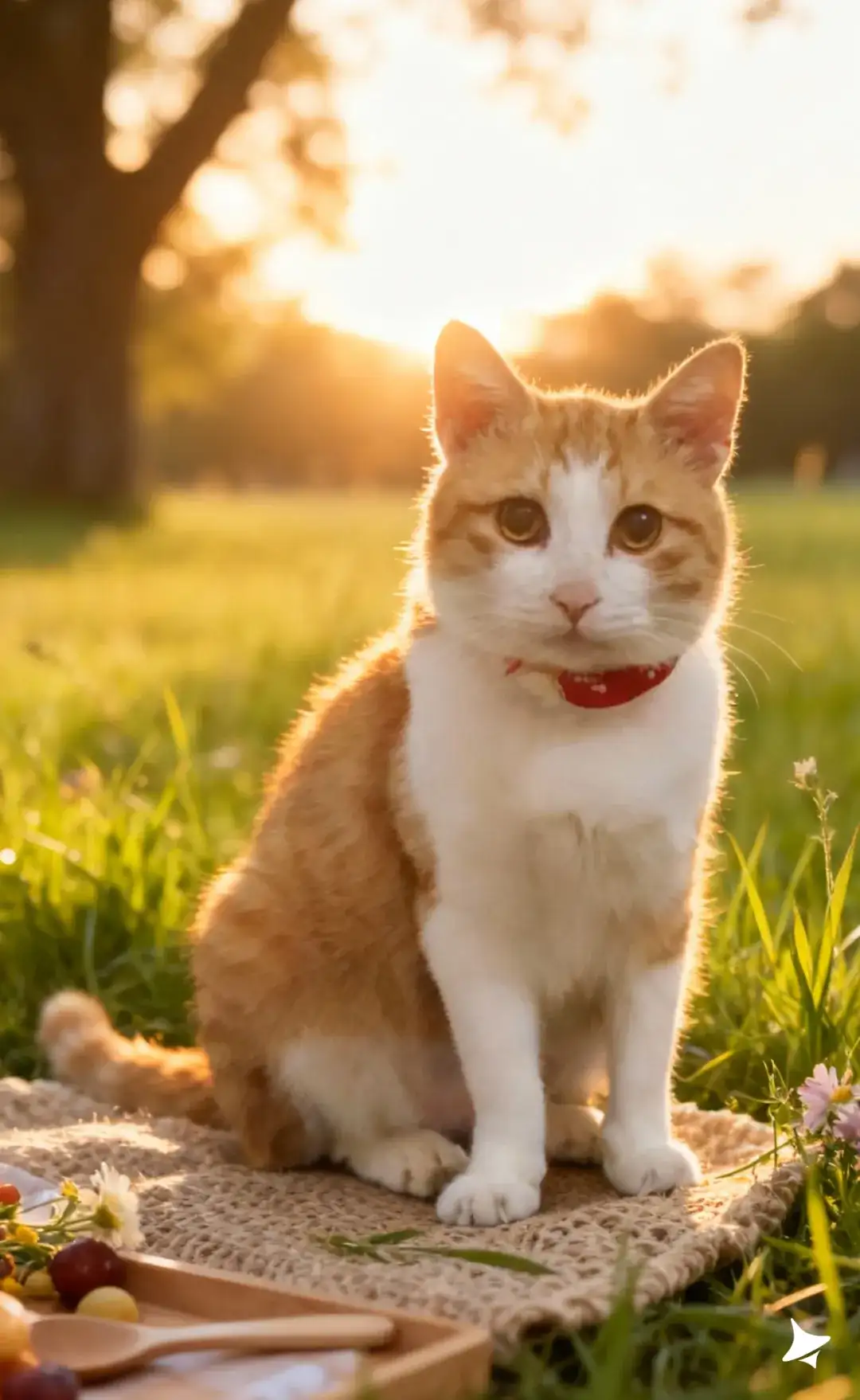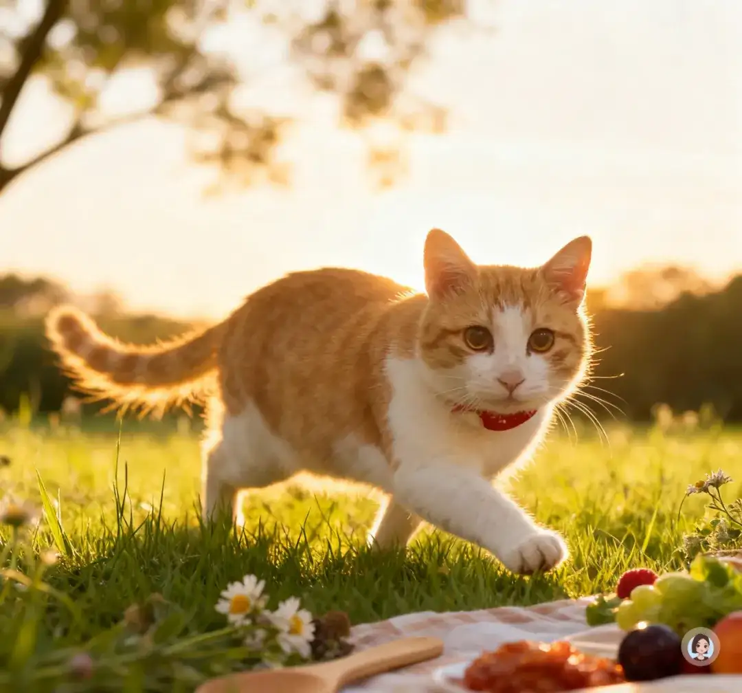 你的橘白猫咪在草地上,生成多个姿势,阳光从背后斜照,毛发呈现金色轮廓光;表情自然、放松,营造户外“自由野餐”的真实氛围。