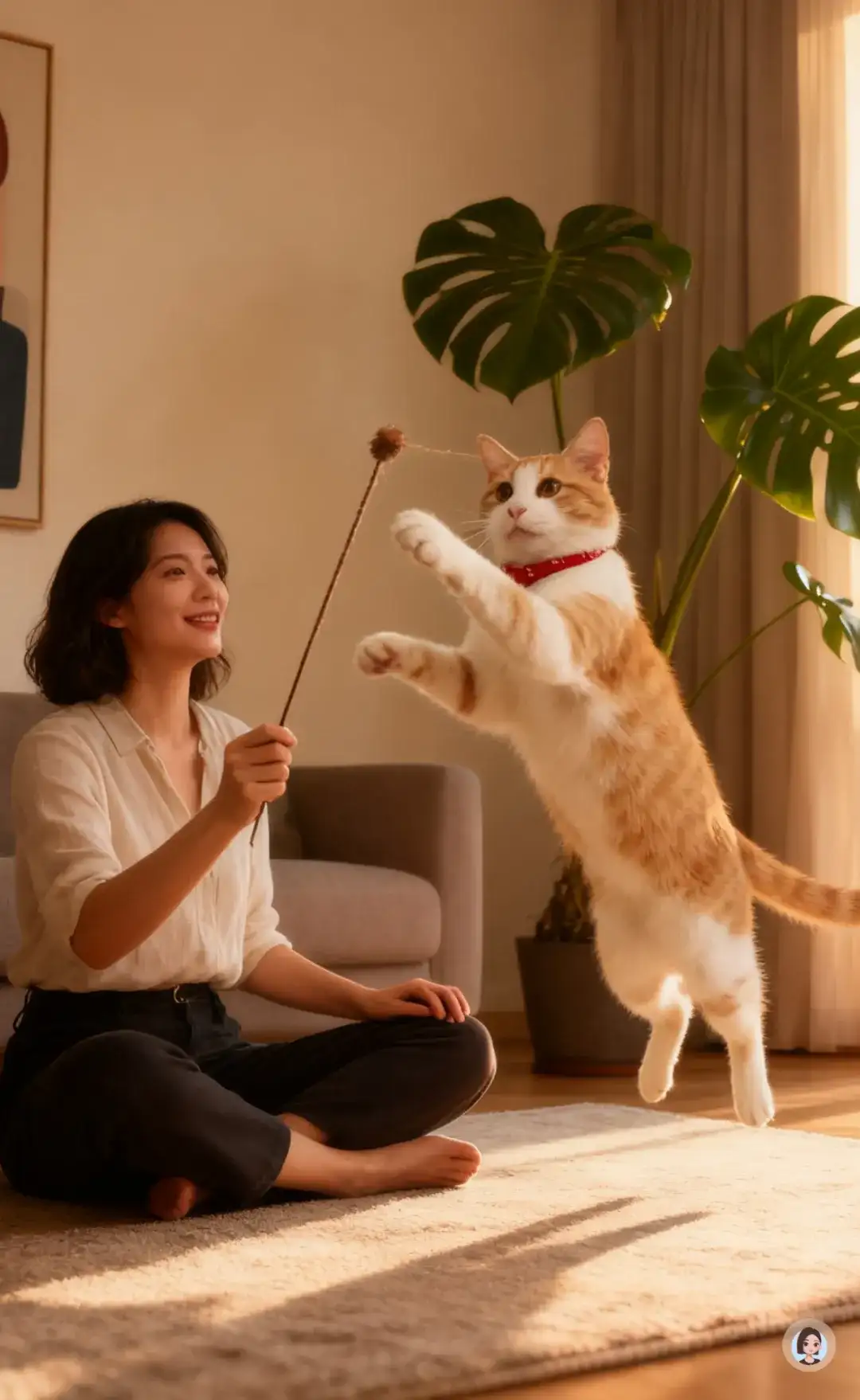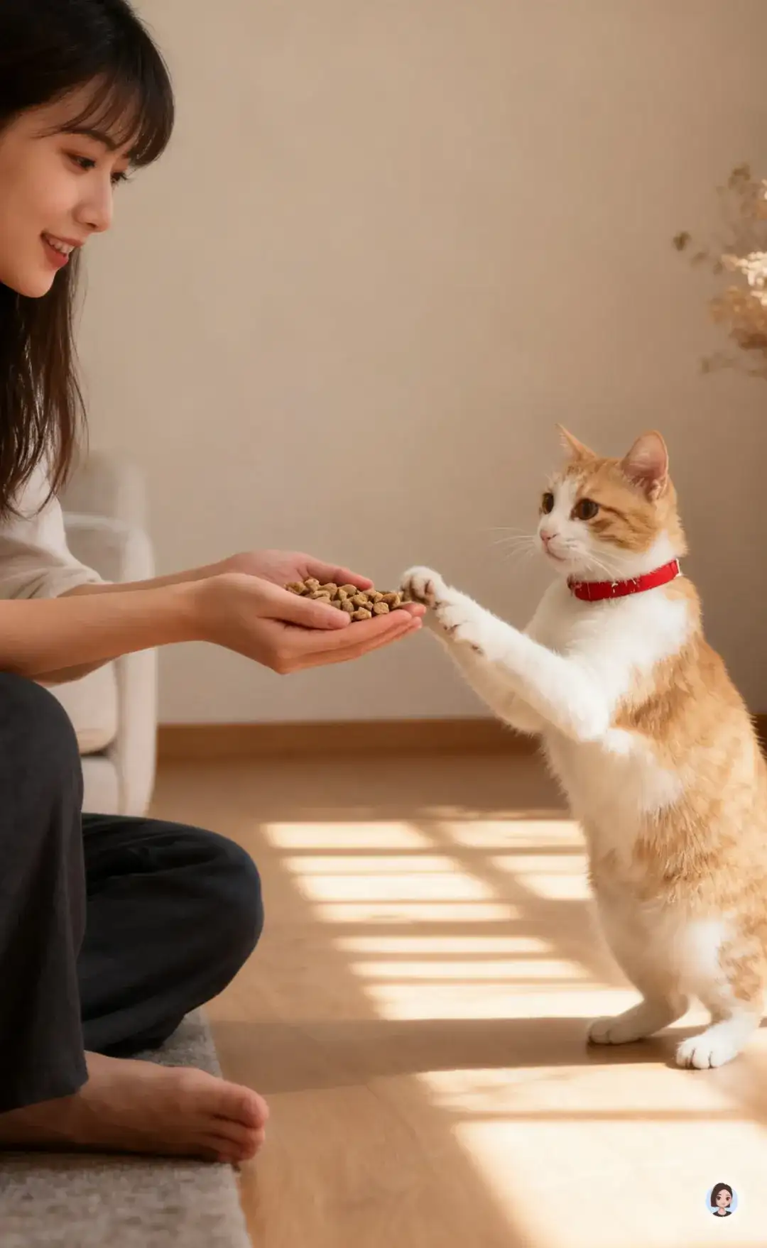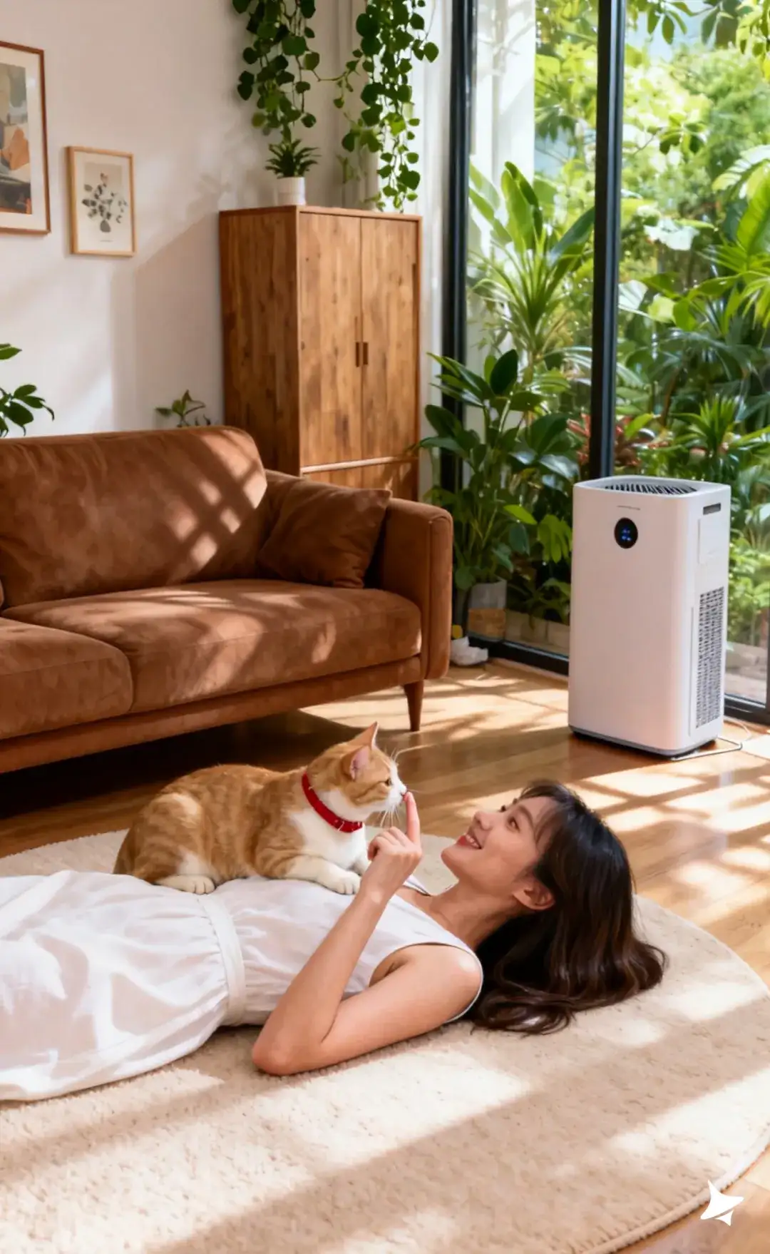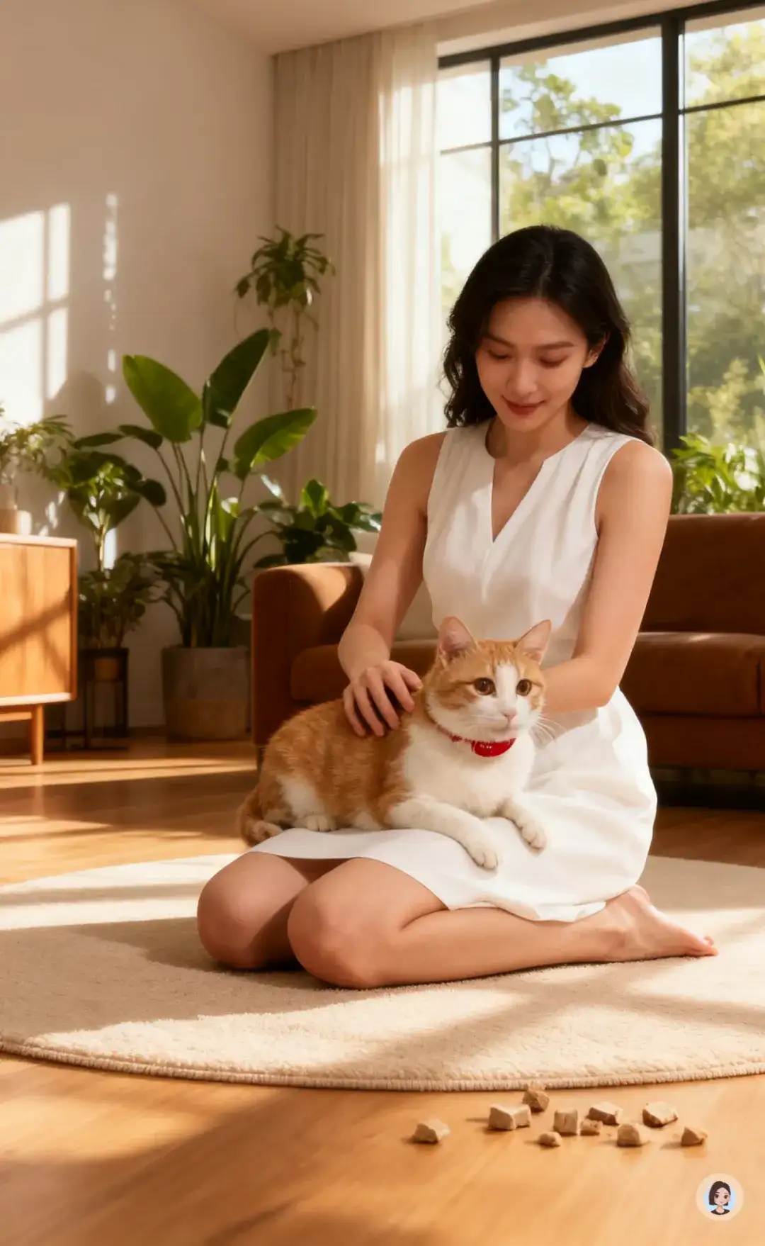 根据上传图片生成4张现代场景主图,温馨舒适的客厅,原木色地板,铺有浅米色圆形地毯,一位穿着白色无袖连衣裙的女士跪坐在地毯上和猫咪玩耍,地板上有冻干颗粒等猫粮;人物面带笑容,背景有棕色沙发,木质柜体,装饰画,还有多株绿植,落地窗外都是绿植,大落地窗户,明暗光影交错,营造出自然且充满生活气息的氛围,画质高清,细节丰富,整体营造出高端的氛围,明暗对比,饱和度中,猫咪重点突出