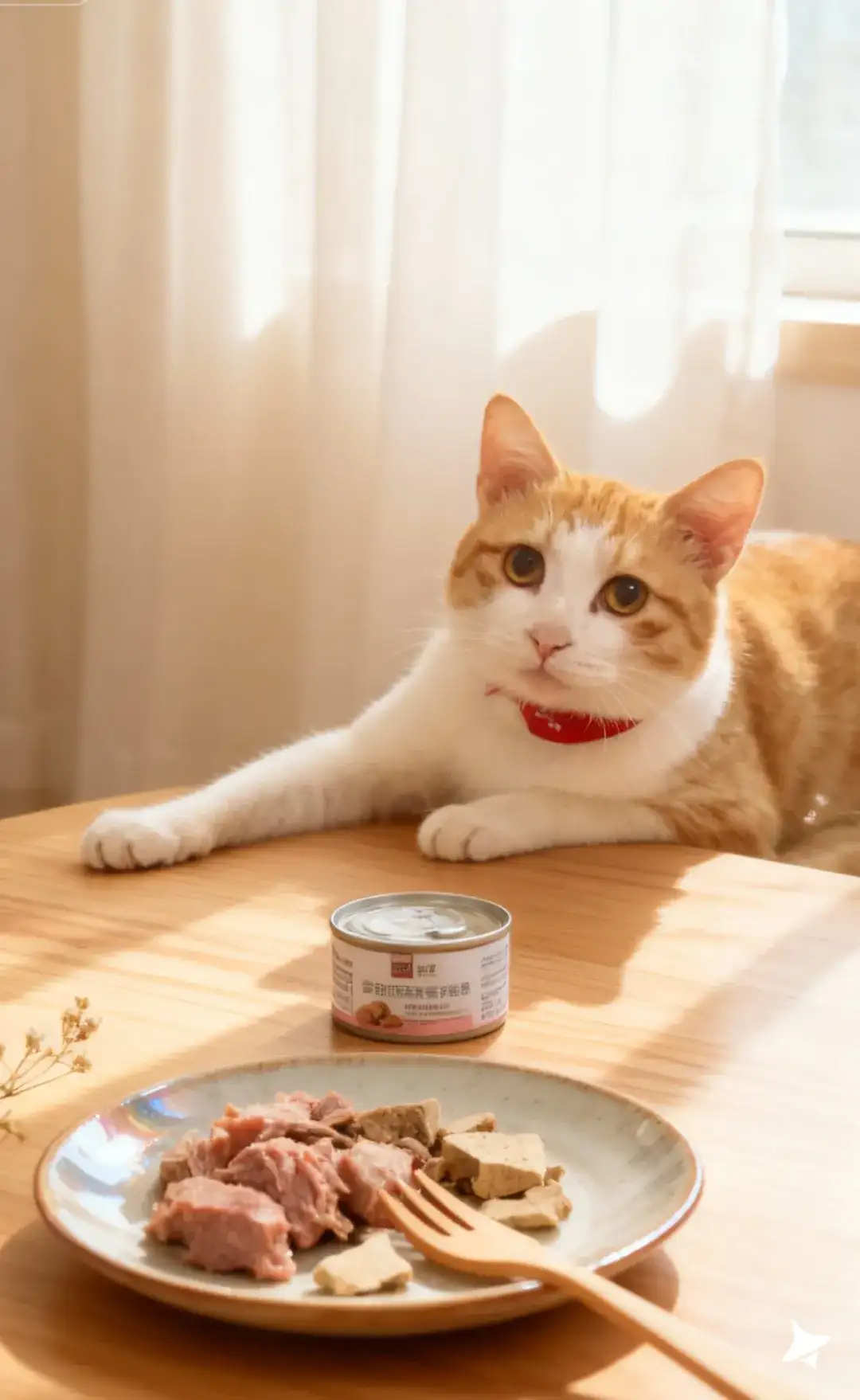 你的橘白猫咪趴在桌面一角,微微探头、表情好奇可爱;毛发被暖光照出轻柔质感,眼睛反射窗光,让情绪更温暖。