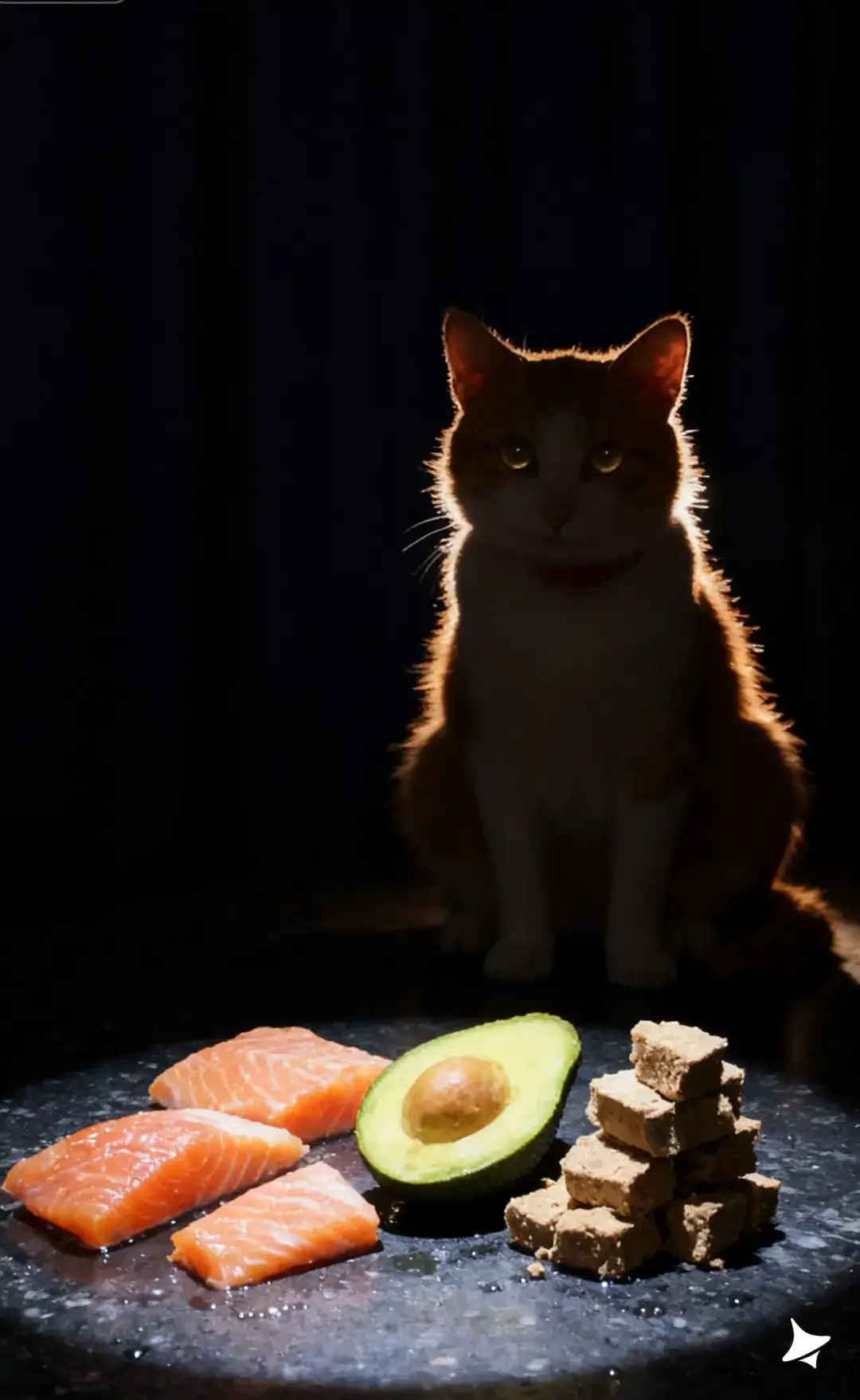 橘白猫咪坐在右边,被一束边缘光勾勒毛发轮廓,形成独特的剪影质感;眼睛反射微光,呈现安静、贵气、神秘的氛围,整体呈现高端、高价、专业食品品牌气质。