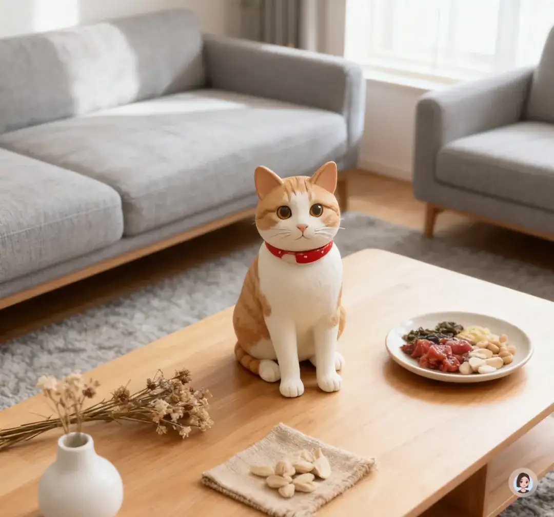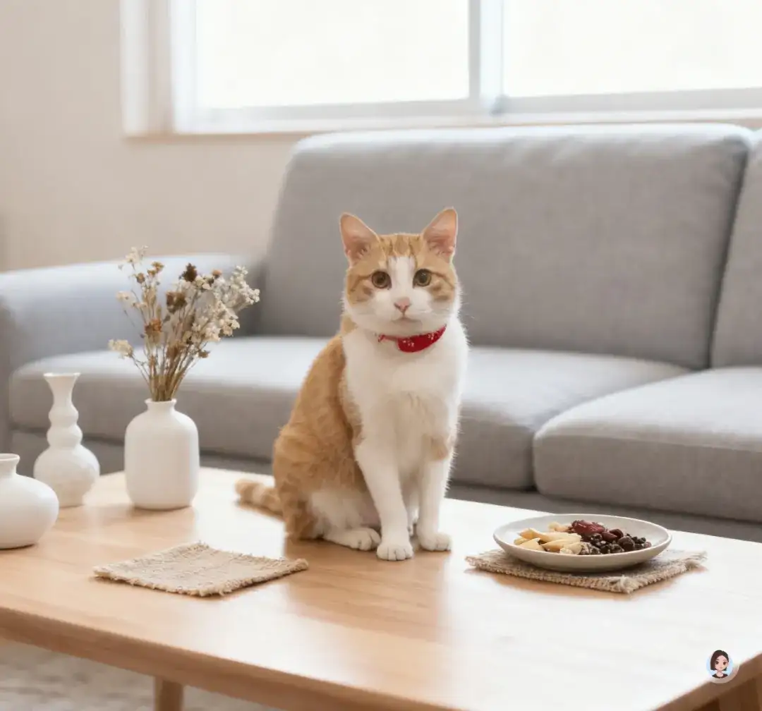 你的橘白猫咪坐在沙发边缘,姿态平静,毛发柔软,红项圈在低饱和背景中格外醒目;眼神温柔,使画面呈现“与猫共居”的生活方式氛围。
