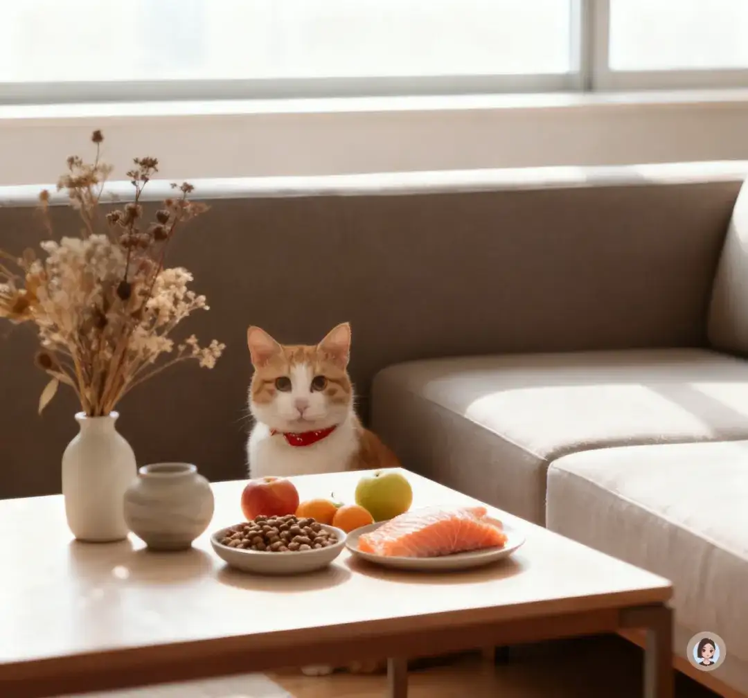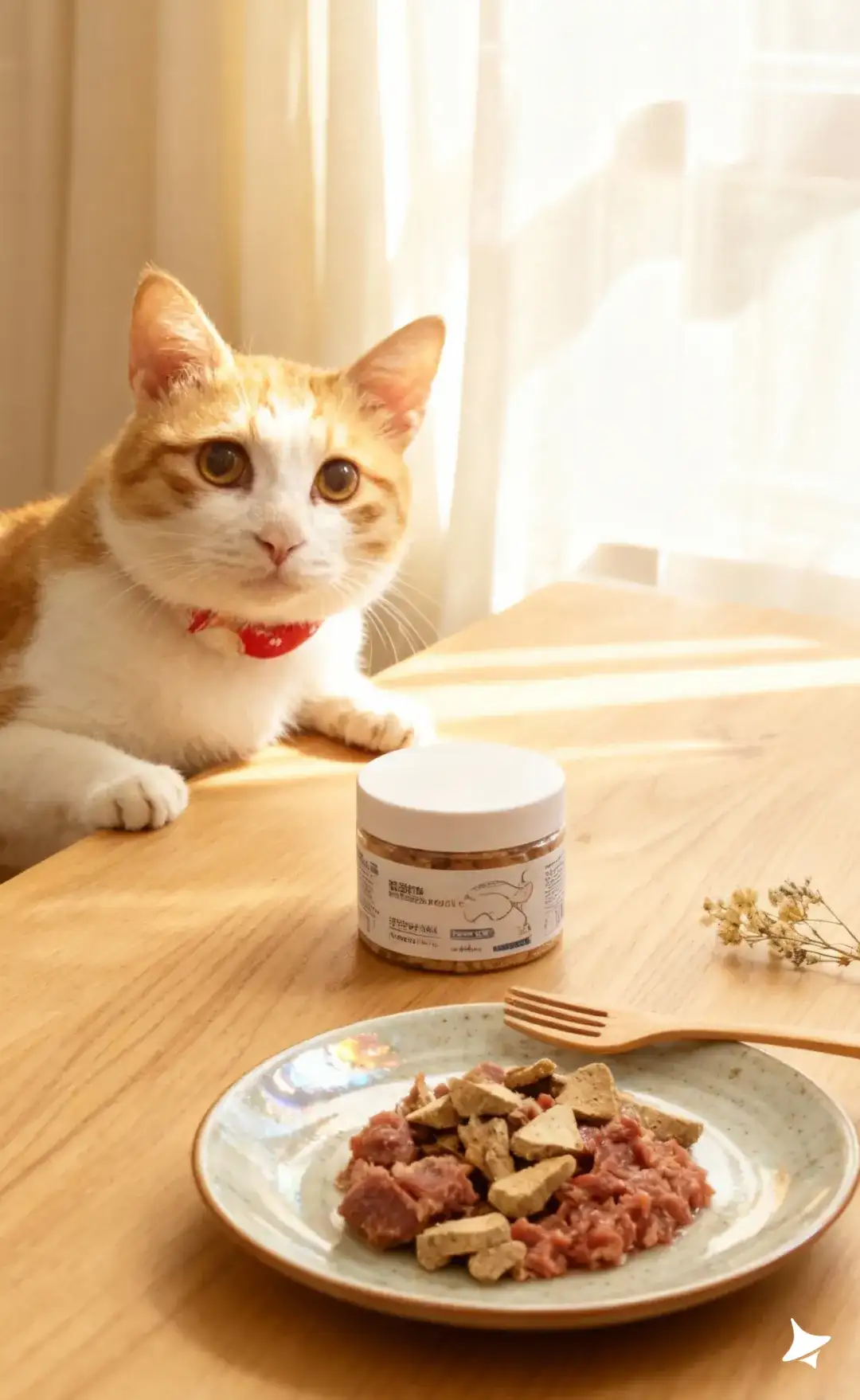 产品摆在桌面中央,旁边使用日式陶瓷盘盛装鲜肉与冻干,陶瓷表面呈现细腻釉面反光;桌面上有轻微道具如小木叉与干花,提升生活感。