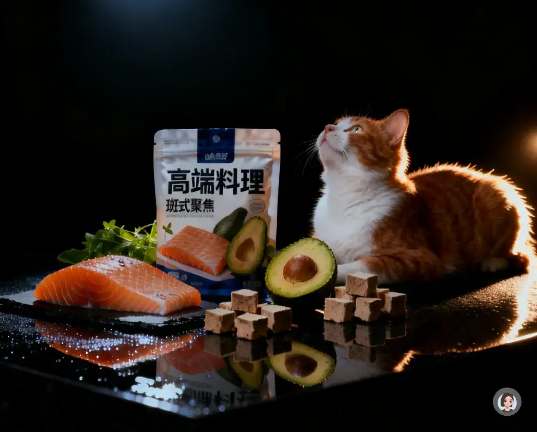 产品置于黑色石材台面上,表面有细腻反射;原料包括三文鱼、牛油果与冻干块,以“高端料理”方式去摆放,带有轻微水珠,增强高级感。